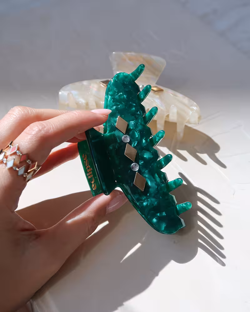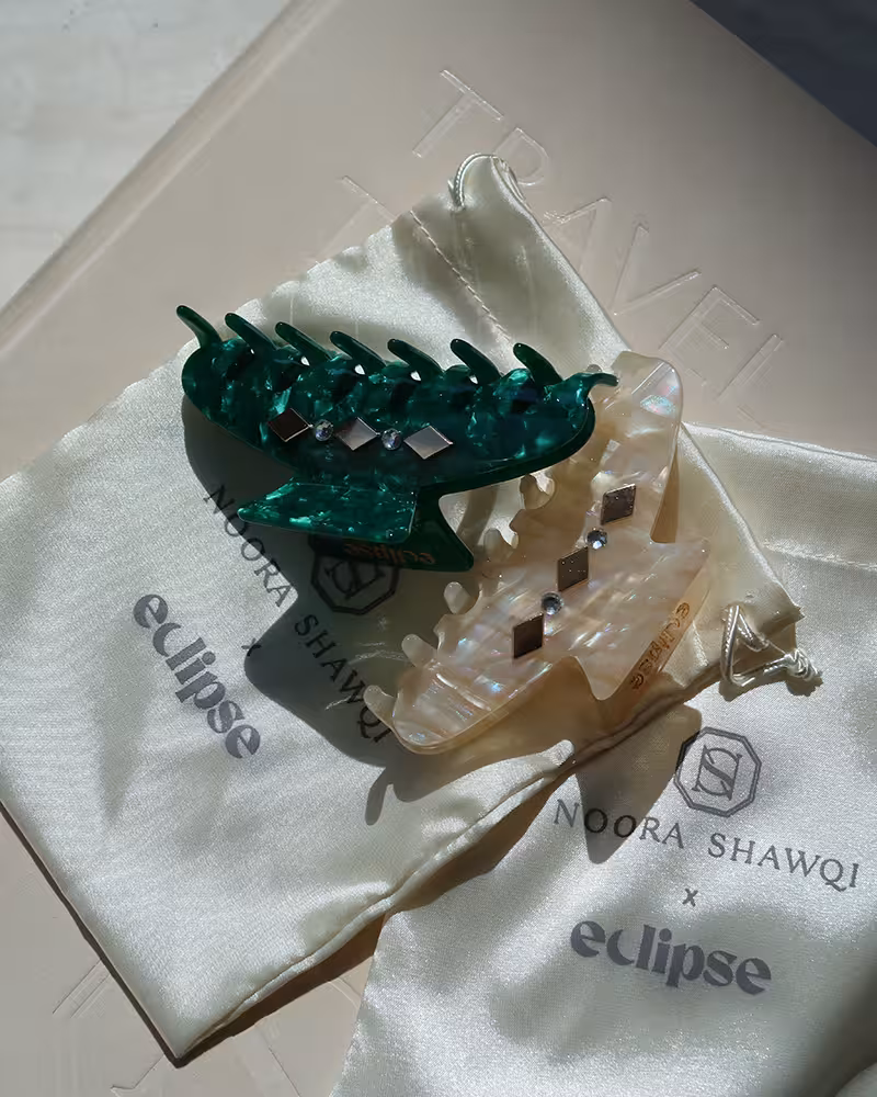 Mosaic Clip مصنوع يدوياً في جنيف بالتعاون مع Eclipse Atelier، الدار السويسرية المتخصصة في تصنيع الإكسسوارات الراقية. جاء بلونَين: الأبيض اللؤلؤي بصفائه الدافئ الذي يُلائم إطلالات الفضة والذهب والكريمي، والأخضر بعمقه المُبهج الذي يضيف إلى أي لون ثراءً بصرياً لا يُقاوَم. كلا اللونَين صُمِّما ليعكسا دفء الذهب ولمعانه، ذلك الدفء الذي نُرادفه دائماً مع بريق شهر رمضان الكريم.