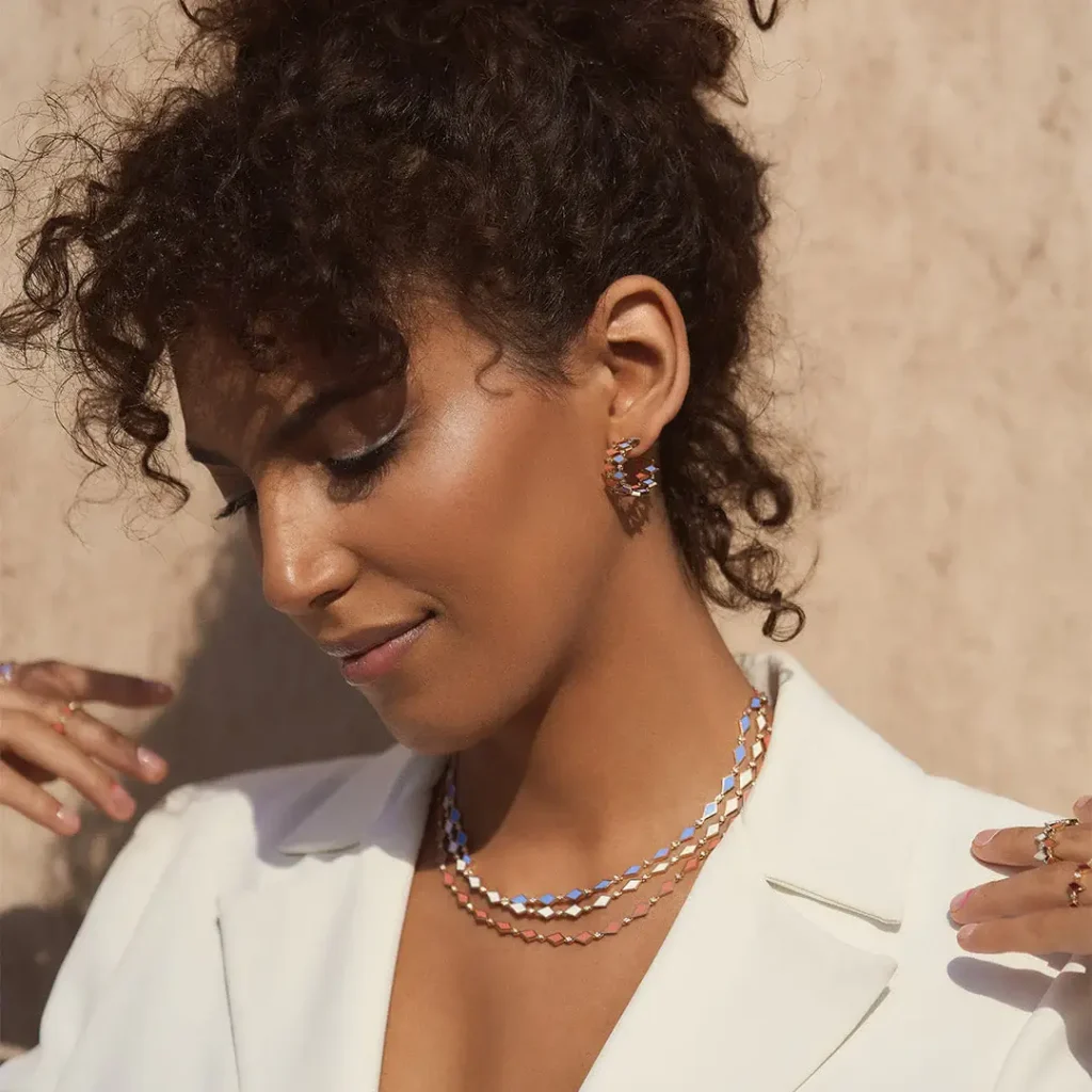 بالطريقة نفسها، تجمع مجوهرات الموزاييك قطعاً صغيرة من الميناء بألوان متعددة، أو بلون واحد في درجات مختلفة، مع الألماس الذي يفصل بين القطع ويضيف إليها بريقاً يجعل كل قطعة تتنفس. وما يُميّز هذا النمط عن غيره هو أن كل مجوهرة منه قابلة للعكس، حين تقلبينها لتظهر وجه آخر مختلف الألوان تماماً. قطعة واحدة وإطلالتان.