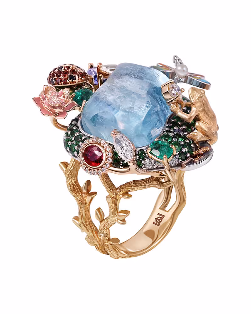 The ring presented here is an exceptional, substantial piece carrying a very large cushion-cut aquamarine. The pale, transparent blue of the stone makes it look like a pool of clear, still water. Around the central stone, a forest of metallic elements and gemstones appears to grow: intricately carved gold flowers, some in rose gold and some yellow, green leaves of emerald or tourmaline, small red ruby beads representing fruits or buds, and twisting branches that coil around the stone. The design is entirely organic, with no symmetry or order, mimicking the natural growth of a garden surrounding a quiet pond.
