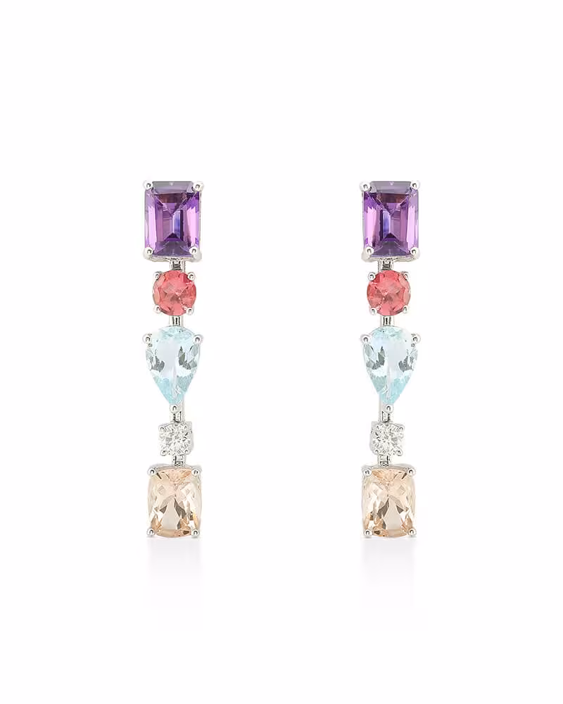 These cascading drop earrings embody this philosophy perfectly. They begin with an amethyst at the point of attachment to the ear, followed by a ruby bead that adds an unexpected warm accent, then a chain of pear-cut aquamarine stones, a touch of a small diamond, and finally ruby stones. The color gradation between the stones creates a beautiful visual depth, and the addition of the purple amethyst makes the piece uniquely distinctive. The yellow gold setting completes the colors in total harmony.