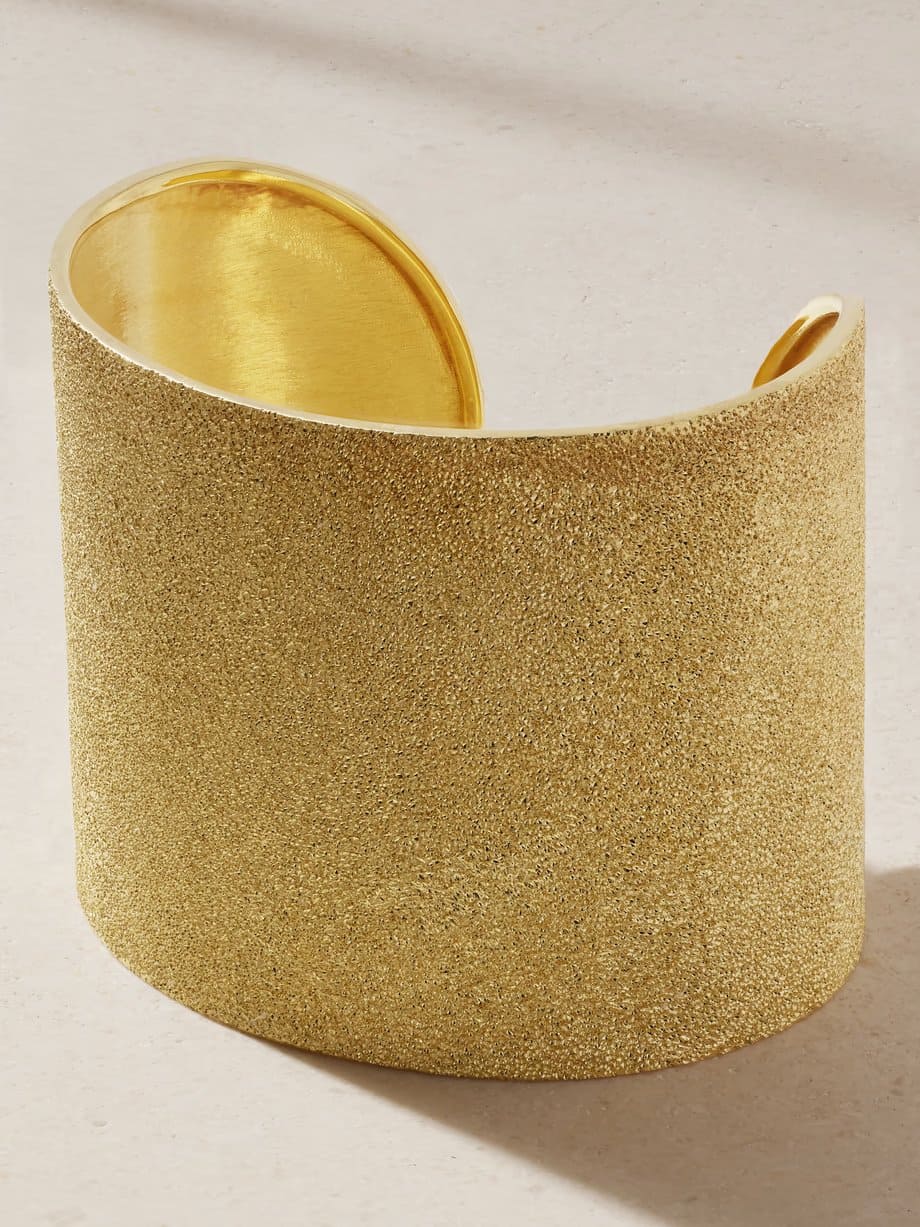 Designer Carolina Bucci has a unique approach to jewelry design, giving her pieces a fine rough texture through the enchanting Florentine technique. This style perfectly complements this wide and chunky gold cuff, which could be a striking piece in your collection of chunky gold jewelry.